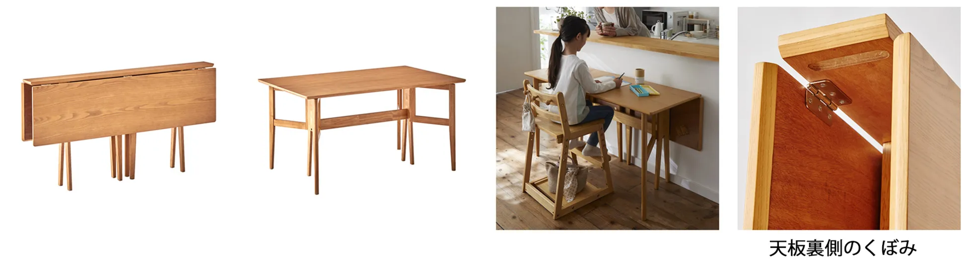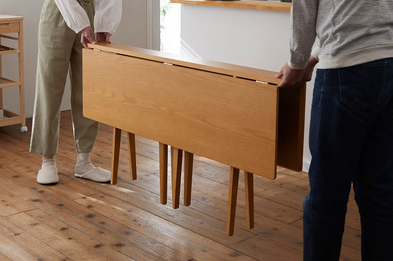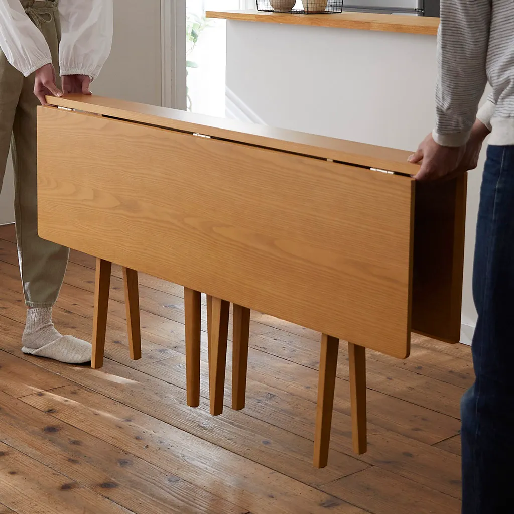 「使わない時は簡単に折りたためるダイニングテーブル」は、縦型に折りたたむことで奥行が17.5センチまで小さくすることができ、手軽に出し入れできるちゃぶ台のような感覚で使うことが出来ます。また、ライフスタイルに合わせて形を変えることが出来るので、使わない時は両面を折りたたんで部屋の隅に置いたり、片面を折りたたんでカウンターテーブルのように使用したりと、家の空いたスペースを有効活用することができる新しいスタイルのダイニングテーブルです。