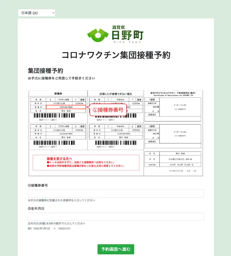 <ワクチン予約システムイメージ(一般用)※実証実験は前画面でxIDを使用>