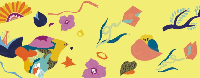 切り絵のように貼り付けたカラフルなデザイン柄がとても印象的で美しい。一つ一つのデザイン柄が色々なものを想像させ、見る人の好奇心を刺激する作品です。