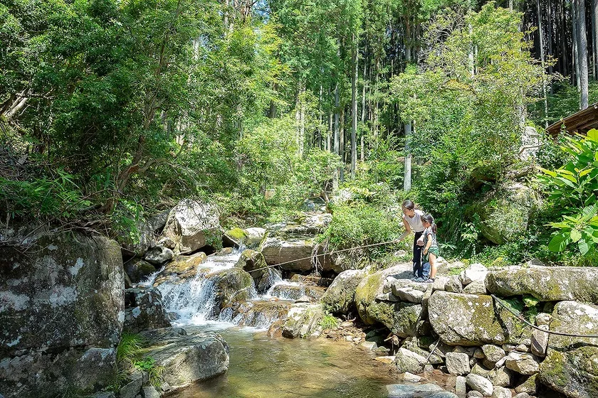 渓流で釣り体験をしたら釣った魚を使った料理を満喫できます。釣れなくても2匹は保証します。