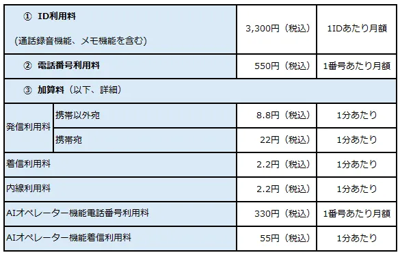 月額料金(※3):(1)ID利用料、(2)電話番号利用料、(3)加算料の合算額
