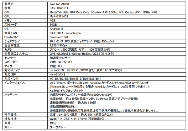 【aiwa tab AS10L主な仕様】