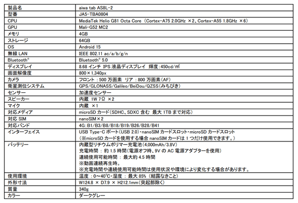 【aiwa tab AS8L-2主な仕様】