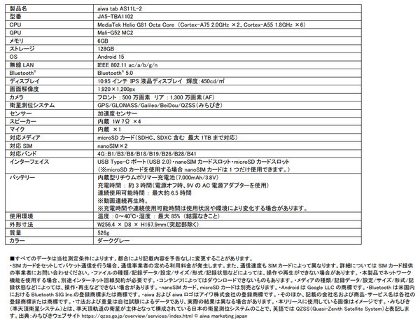 【aiwa tab AS11L-2主な仕様】