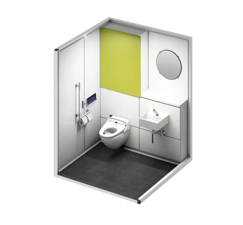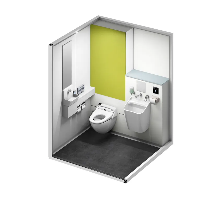 今回、LIXILでは、物流センターや工場のトイレを通じて職場環境改善に貢献してきた可動式アメニティブース『withCUBE』を初めて機能分散型パブリックトイレとして展開します。非接触型の仮想タッチパネルリモコンを搭載したトイレなど、様々な新技術を取り入れています。