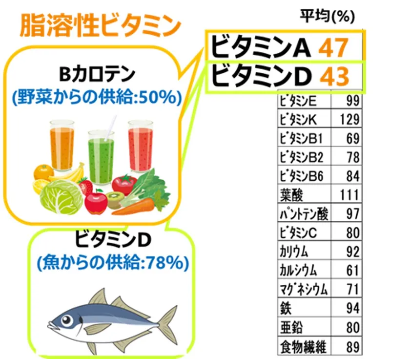健康維持・増進のために必要な推奨量/目安量に対する摂取量の割合(%)