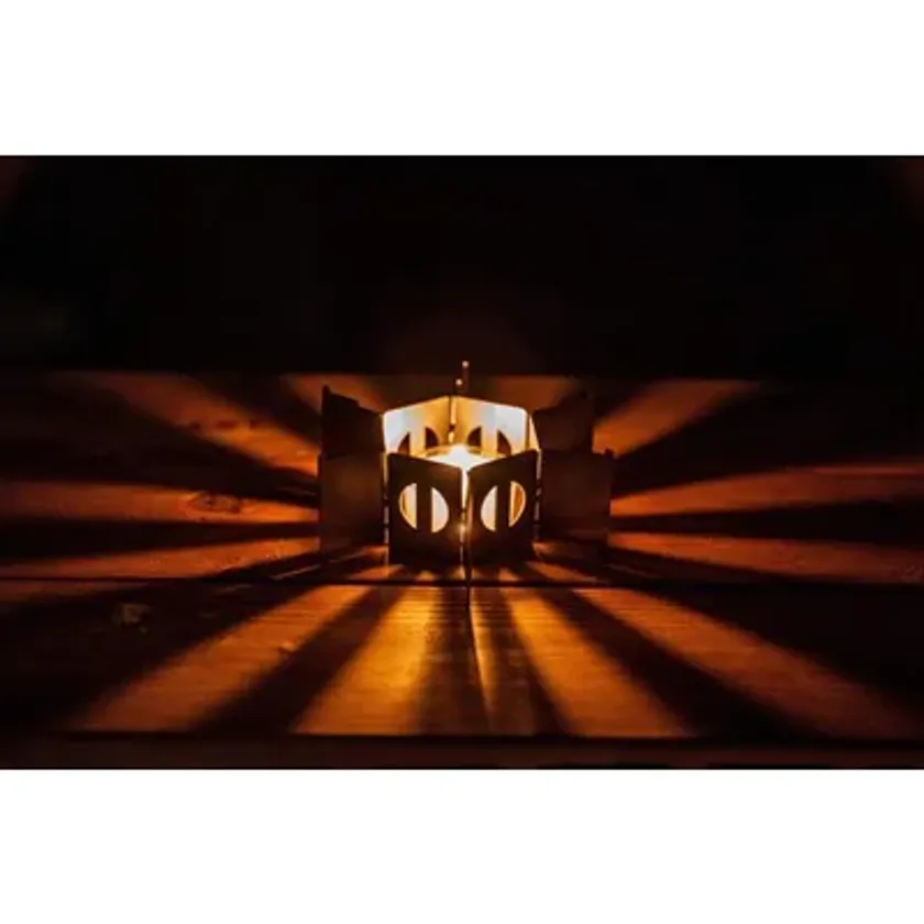 精密板金メーカー・アイザワが50年以上培ってきた技術を、産業分野だけでなく誰にでも気軽に手に取ってもらえるアイテムに活かそうという発想から生まれたキャンプグッズ。「曲げ」や「切断」「プレス」など金属加工の技術を注ぎ込んだグッズは、どれも他社にはないアイザワならではのギミックの世界を堪能できます。can+roは、羽根を折りたためば直径わずか6cmになる手のひらサイズの折り畳み式コンロ。羽根を広げて真ん中にキャンドルをセットすればスタンバイ完了の優れものです。ちょっと火が欲しいなという時に、おつまみをあぶったりコーヒーを温めたりと、様々なシーンで活躍します。