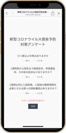 チェックイン時に、直近の体調や渡航歴等のアンケートを実施します。(事業者様がご希望されない場合外すことも可能)