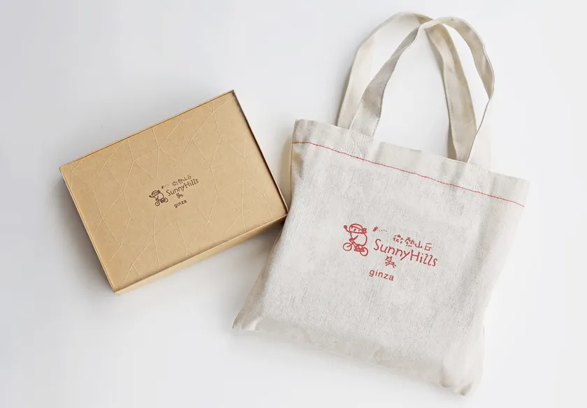 銀座店限定デザインのパッケージと布袋の「SunnyHills銀座セット」は、サニーヒルズの二枚看板であるパイナップルケーキとりんごケーキの両方を楽しんでいただけるセットです。