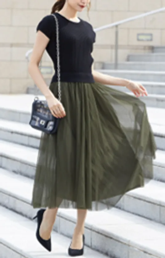 1枚でサマになる、コーデいらずの異素材を組み合わせたドッキングワンピース。さらっとしたリブ編みのニットと、軽やかな2枚重ねのチュールスカートは、着るだけでレディライクなスタイリングに。