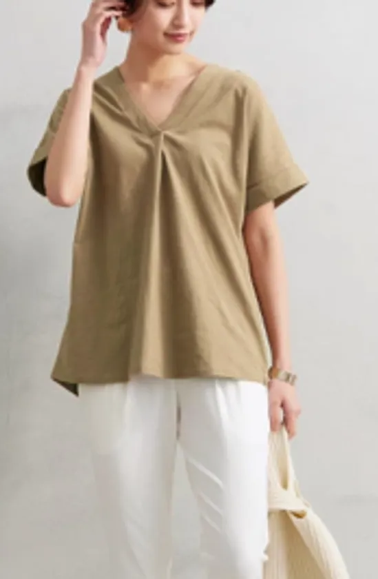 肌触りの良い綿100%のカットソー生地を使ったトップス。首元は前後共Vネックで、顔周りをスッキリと見せてくれます。袖は気になる二の腕が隠れる長さで、袖口はこなれ感を演出できるロールアップ仕上げ。ゆったりとした身幅で、裾に向かってやや広がるシルエットが快適な着心地をサポートしてくれます。カジュアルな印象のTシャツも、フロントタックが作る縦ラインできちんと感を与えて、どんなボトムスにも合わせやすく「頑張り過ぎずに、きちんとコーデ」が叶う大人アイテムです。