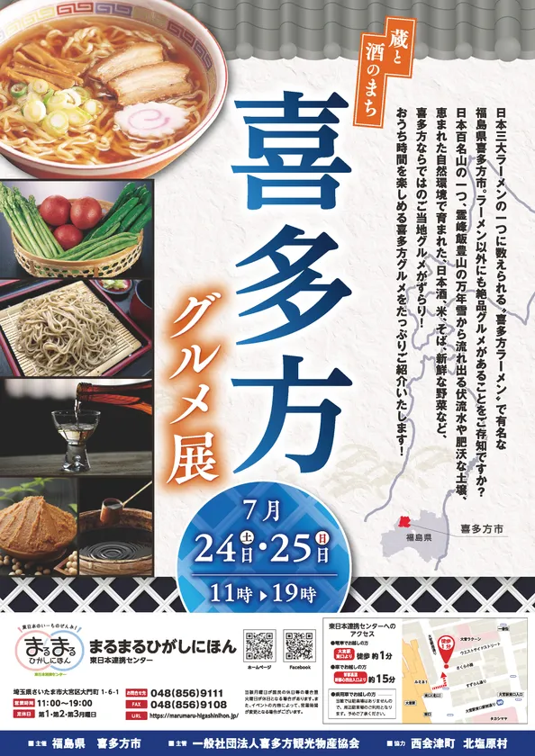 さいたま市大宮駅東口目の前の東日本連携センター「まるまるひがしにほん」では、きたる2021年7月24日(土)・25日(日)の2日間「蔵と酒のまち 喜多方グルメ展」を開催します。日本三大ラーメンの一つに数えられる“喜多方ラーメン”で有名な福島県喜多方市ですが、福島県の豊かな自然から生み出されるお米や蕎麦、新鮮な野菜なども自慢のご当地品です。