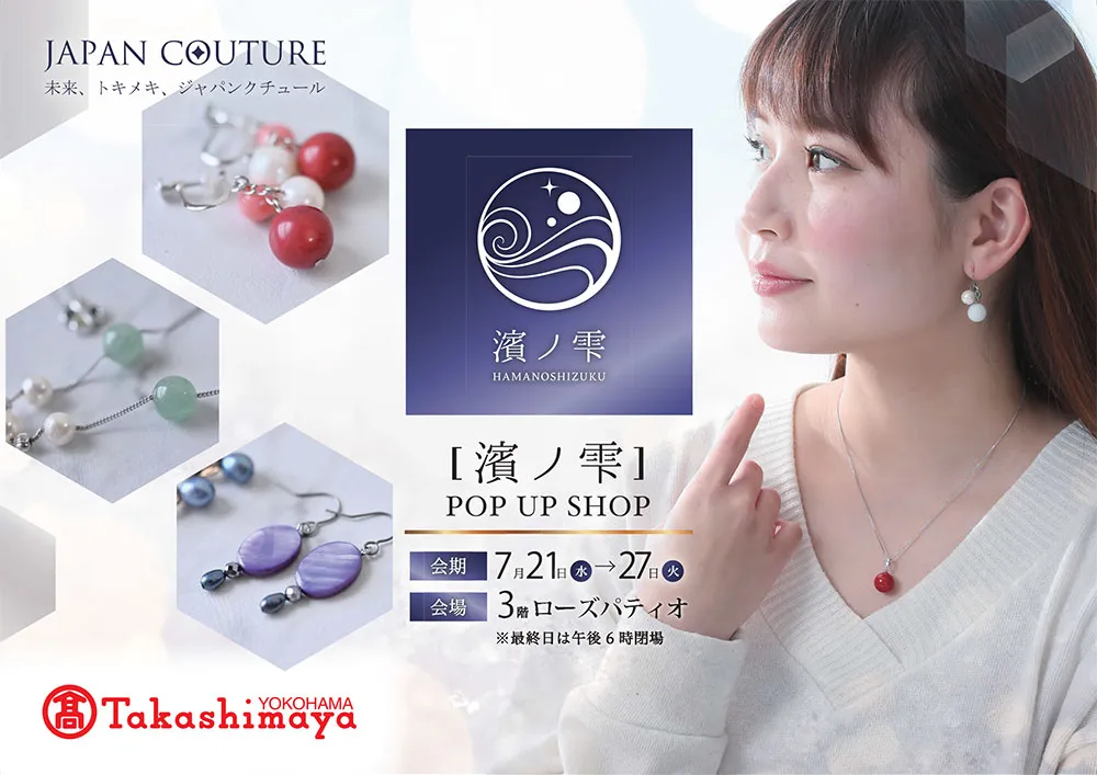 「ときめく真珠」をコンセプトに、あこや真珠を主力素材として扱うジュエリーメーカー、日本雑貨株式会社(神奈川県横浜市/代表取締役 半田紗知子)は、2021年7月21日より、横浜高島屋3階フロアにて、ポップアップショップ「濱ノ雫(はまのしずく)」をオープンします。