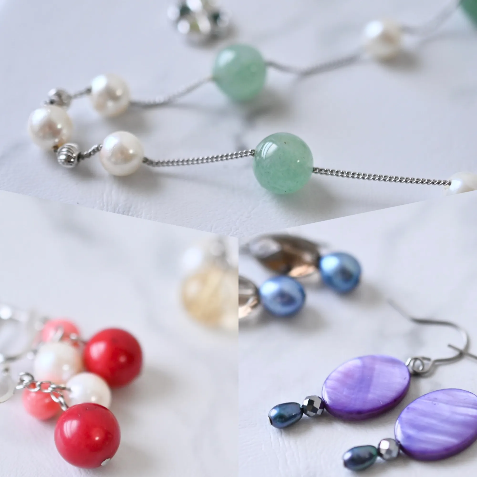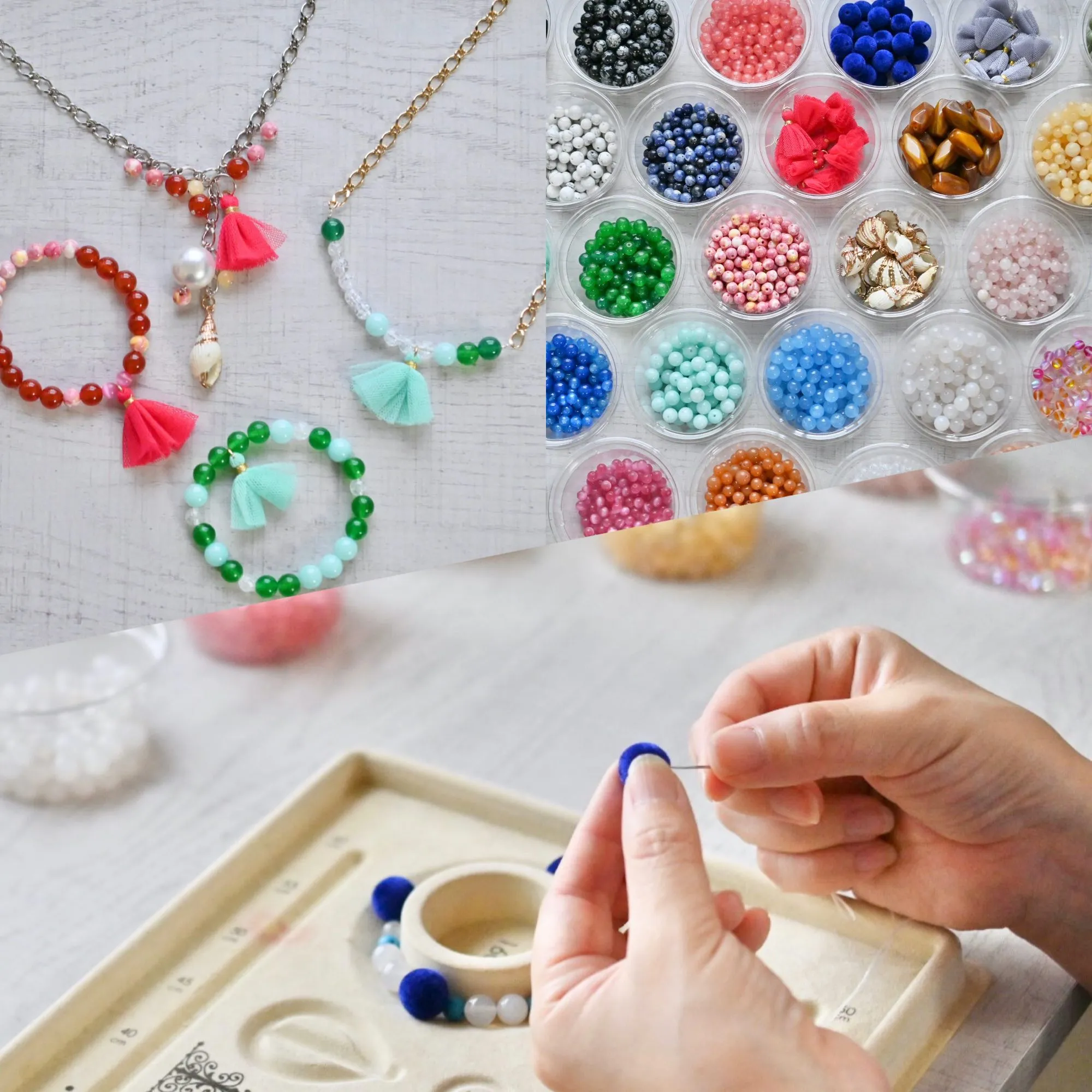 鮮やかな天然石やパーツを使って、ネックレス・ブレスレット・イヤリング・ピアスの中から お好きなアイテムをお作りいただけます。