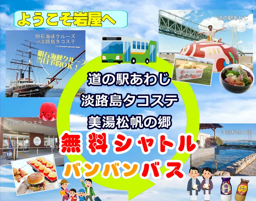 バンバンバスは、淡路島の玄関口「岩屋ポートターミナル」を出発し、世界一の長さを誇る吊り橋「明石海峡大橋」やご当地グルメを楽しめる下記施設を周遊します。夏休み期間中、高速艇で淡路島を訪れる観光客の利便性向上のため、導入を決定しました。