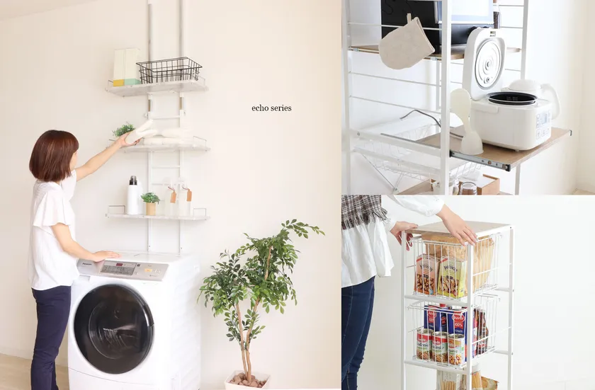 突っ張り式で狭い場所でも設置可能な、洗濯機上のスペースが有効活用できるランドリーラックです。