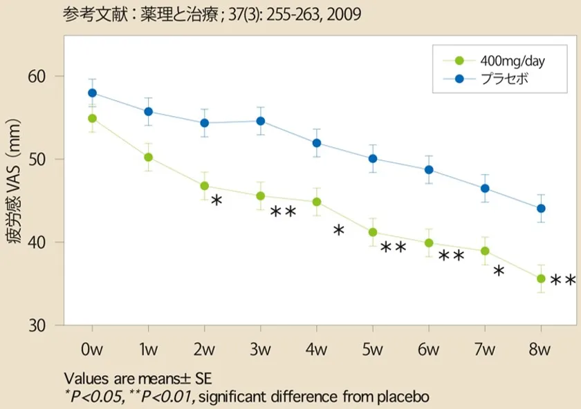 それぞれ1週間ごとに疲労感を測定したところ、イミダゾールジペプチドを毎日400mg摂取した群は疲労感の有意な低下がみられました。