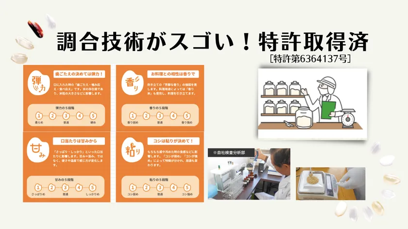 そのような思いから「ブレンド米調合支援システム(特許第6367137号)」を開発し、システムを使用して、その時々のお米をすべて数値で管理を実施。実際にお客様がお米に求めるものを安定して届け続けることが実現できるようになりました。「カスタム米」、お米業界の常識をくつがえす新商品に挑戦致します。