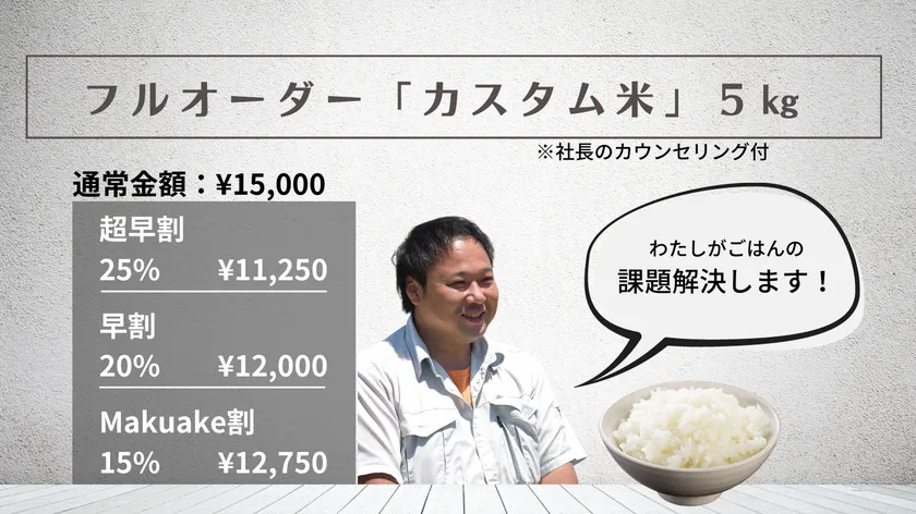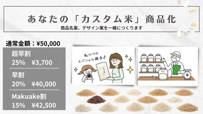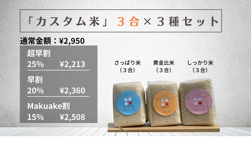 例:「カスタム米」3合×3種類セット、フルオーダー「カスタム米」5kg、カスタム米商品化