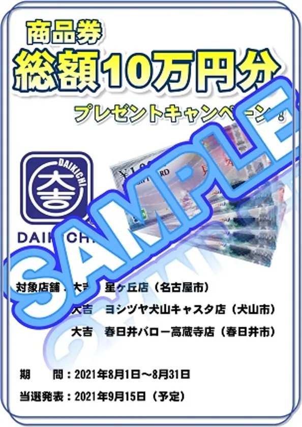 e-Na株式会社(本社:愛知県名古屋市、代表取締役社長:室井 崇弘)は、「買取専門店大吉 星ヶ丘店(名古屋市)」「買取専門店大吉 ヨシヅヤ犬山キャスタ店(犬山市)」「買取専門店大吉 春日井バロー高蔵寺店(春日井市)」の3店舗で、2021年8月1日から8月31日の期間にご利用いただいたお客様の中から抽選で、総額100,000円分の商品券をプレゼント(10,000円×10名様)する『買取応援キャンペーン』を開始します。