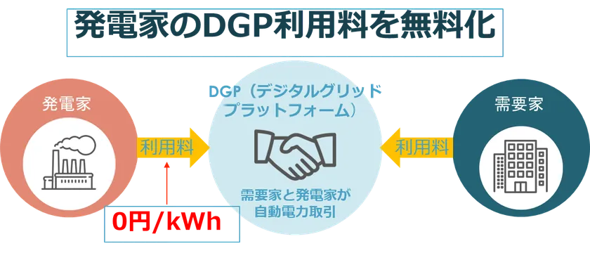 これまでデジタルグリッドでは、DGPを利用する発電家から発電電力量(kWh=キロワットアワー)に応じた利用料をいただいていました。今回、この利用料を無料にすることで、発電家によるDGPの利用が増え、電力の需要家にとっては購入する電源卸価格が下がることが期待できます。