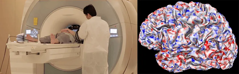 図3:NICT CiNetで導入しているMRI装置(左)とスキャンした結果から推定した脳の活動状態(右)