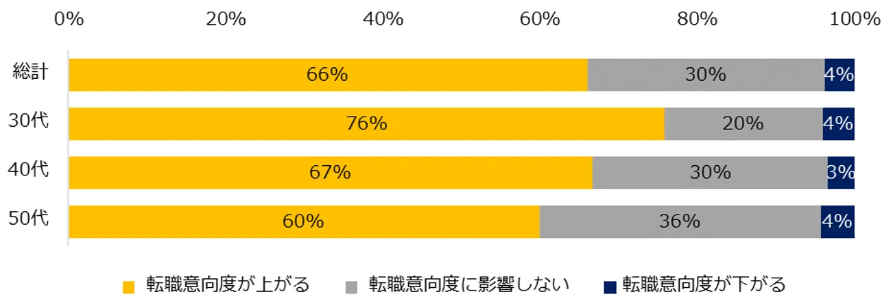 また「柔軟な働き方ができることで、転職意向度に変化は生じますか?」と伺ったところ、66%が「転職意向度が上がる」と回答しました。柔軟な働き方の導入の有無が、社員の不満や転職意向の醸成につながることが分かります。
