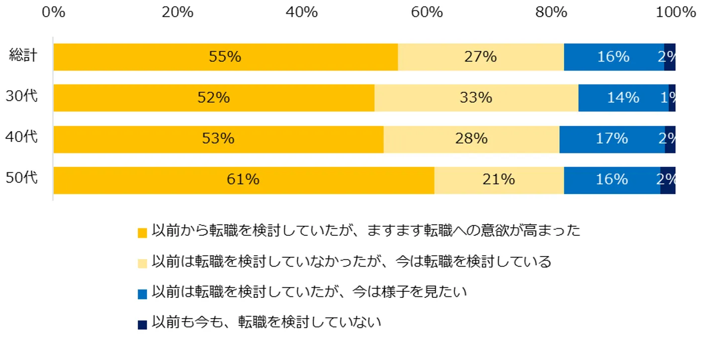 「コロナ禍の前後で、転職意向に変化はありましたか?」と伺ったところ、55%が「以前から転職を検討していたが、ますます転職への意欲が高まった」、27%が「以前は転職を検討していなかったが、今は転職を検討している」と回答しました。