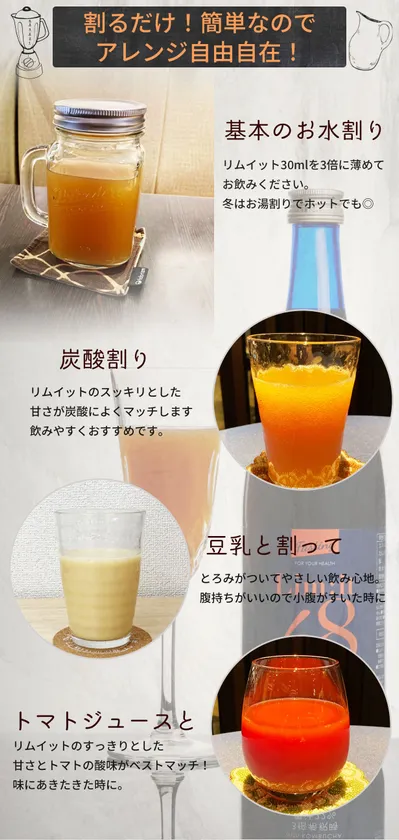 薄め方は水でも炭酸水でも豆乳やトマトジュースなどバリエーションも楽しんでいただけます。朝一番は「ホットリムイット」もおススメです。凍らせてシャーベットにしたり、ヨーグルトにかけたりアレンジをお楽しみいただけます。