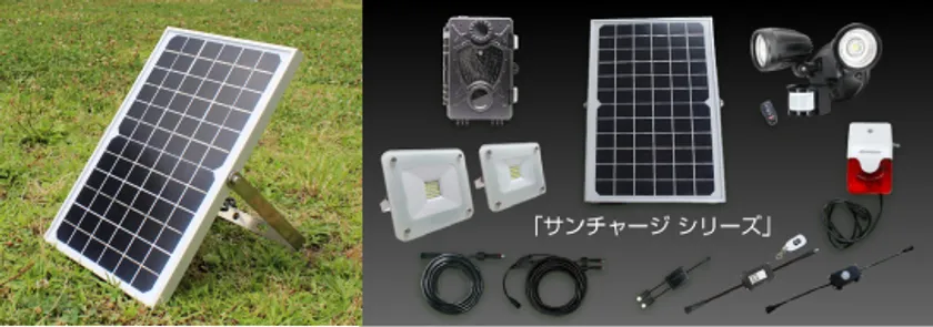 ソーラーパネルにバッテリー付きなので蓄電と給電が同時にできる。もちろん昼に蓄電、夜に給電することも可能です。また、サンチャージ12シリーズの商品につなげることでいろいろな場面に使えてしかも簡単に設置できます。繋げる商品には防犯カメラ、サイレン、人感センサーライト、携帯充電モジュールなど、目的に応じた機器を設置可能。
