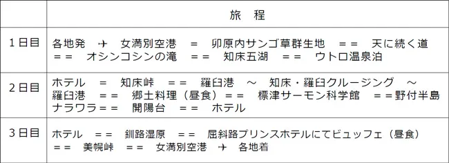 中国・四国地方の各空港から女満別空港へは直行便の定期運行がないため、通常乗り継ぎを含め片道10時間かかるところ、日本航空チャーター直行便を利用することにより、所要時間は 2時間30分となり大幅に時間を短縮することができます。また、女満別空港に直接乗り入れることで、道東を3日間の行程で効率良く観光することが可能となります。