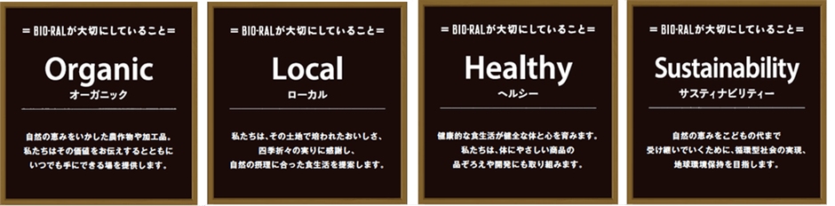 ビオラルのコンセプトである“オーガニック・ローカル・ヘルシー”をキーワードに、健康でナチュラルなライフスタイルを提案しています。体に優しい素材や製法、健康や自然志向にあわせたプライベートブランド“BIO-RAL”を始め、専用のマシーンで作るナッツバターやオーガニック農産物、自然の恵みをいかしたオーガニック食品など、健康にこだわった体にやさしい食品を豊富に取りそろえております。