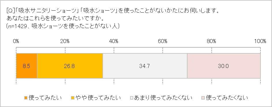 さまざまなフェムテック商品を販売しているフェルマータのショップで、とくに人気なのが、ショーツ自体に水分を吸収する機能を持たせた吸水ショーツ。生理のときやおりものが気になるときなどに使用できることで話題になっており、今回の調査でも1/3以上にあたる35.3%の人が「使ってみたい」と答えています。母娘で使っている人や、更年期以降の尿もれ対策として使っている人もいて、幅広い年代の悩みを受け止めてくれる商品だと実感しています。コロナ禍で家にいる時間が増え、自分の体を見つめなおす時間が多くなったことも、こうした商品にトライする人が増えた理由のひとつだと思います」(中村さん)。