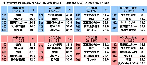 50代以上男性では1位「ウナギの蒲焼」、50代以上女性では1位「夏野菜のカレー」
