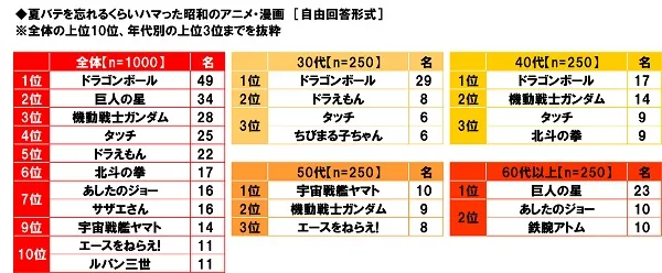 年代別にみると、30代と40代では「ドラゴンボール」、50代では「宇宙戦艦ヤマト」と壮大な宇宙を舞台にした作品がトップとなり、60代以上では「巨人の星」と“スポ根”作品がトップとなりました。