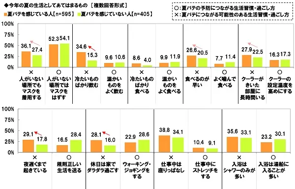 夏バテさんの3割半が「冷たいものばかり飲む」「人がいない場所でもマスクを着用」、約3割が「クーラーがきいた部屋に長時間いる」「夜更かし」「休日は家でダラダラ」