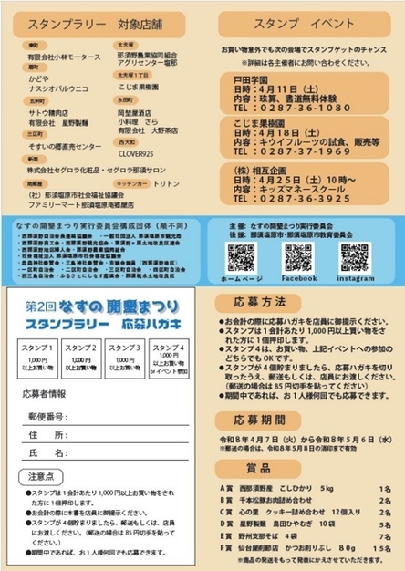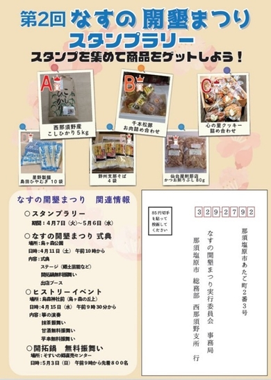 開催内容:なすの開墾まつり式典、ヒストリーイベント、開拓鍋の無料配布、スタンプラリー
