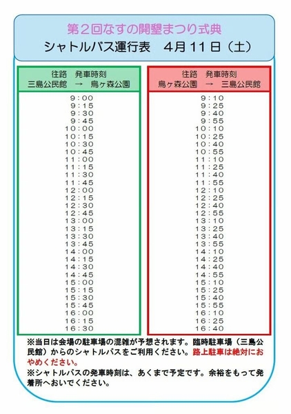 4月11日(土)は、会場周辺の混雑が予想されるため、臨時駐車場(三島公民館)からシャトルバスを運行します。
