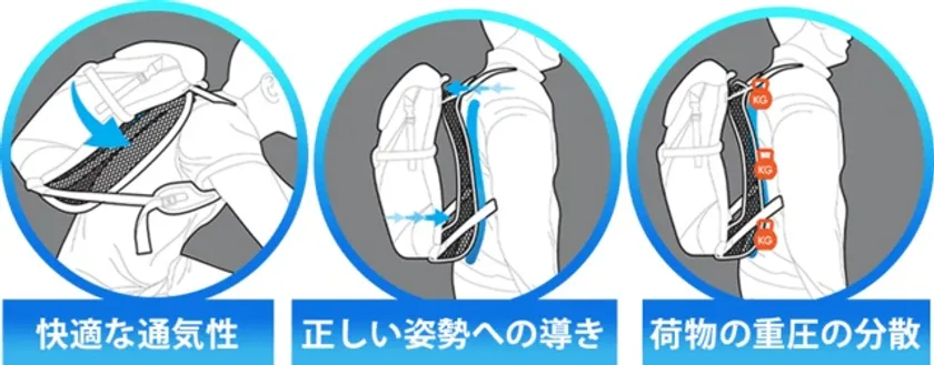 メッシュで重量を背中全体に分散するので負担を軽減します。
