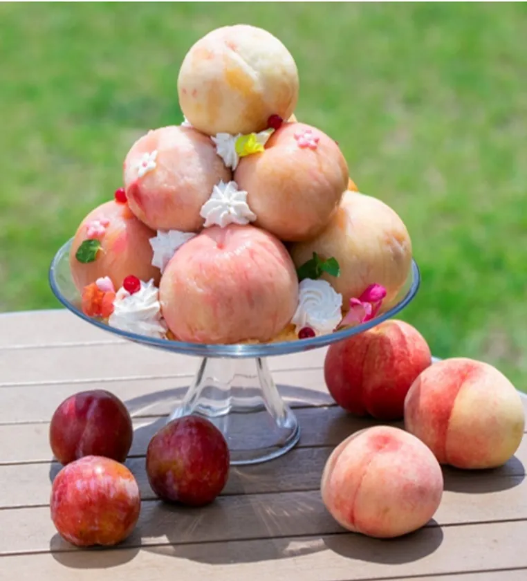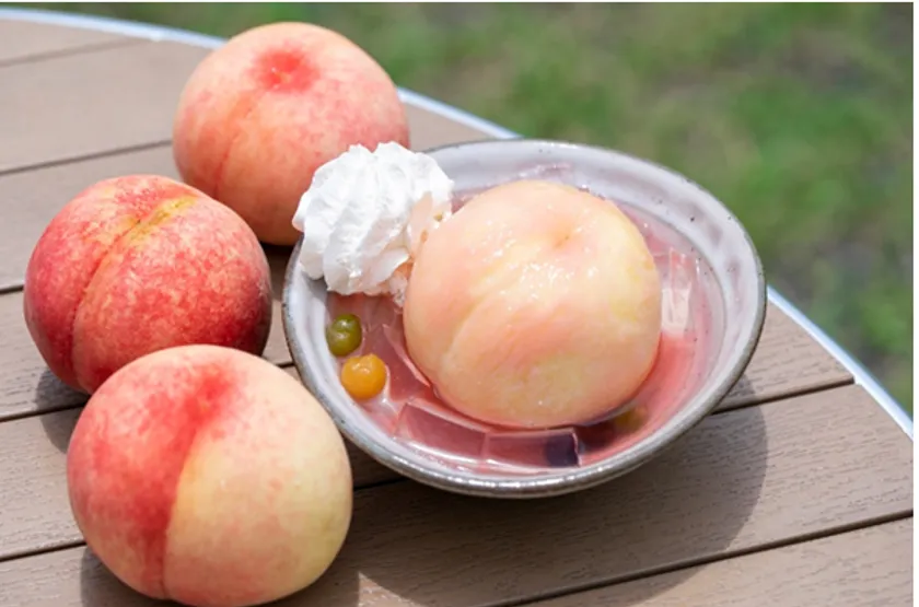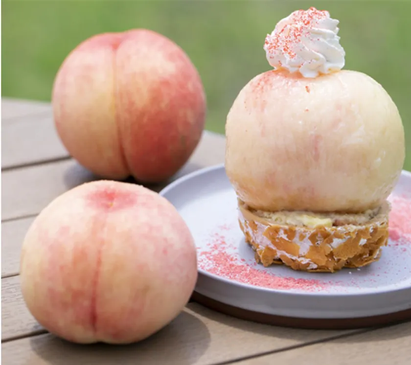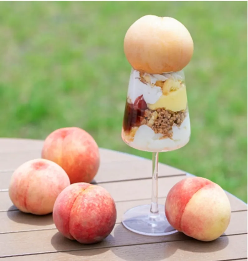 桃をまるごと10個使用!中にはジューシーな桃と相性の良いスイーツをいっぱい詰め込んだ夢のようなスイーツに仕上げました。桃のおいしい産地だからこそできるスペシャルな桃スイーツです。ぜひ一度召し上がれ。