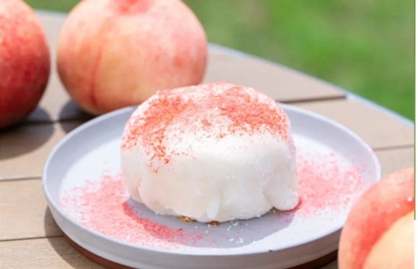 ジューシーな桃とたっぷりホイップクリーム、ふわふわスポンジをもちもちの求肥シートで包みました。桃を使用した和スイーツです。