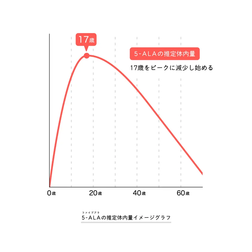 5-ALAは人の体内でも生成されるアミノ酸ですが、17歳をピークにその生成量は年々減少していきます。