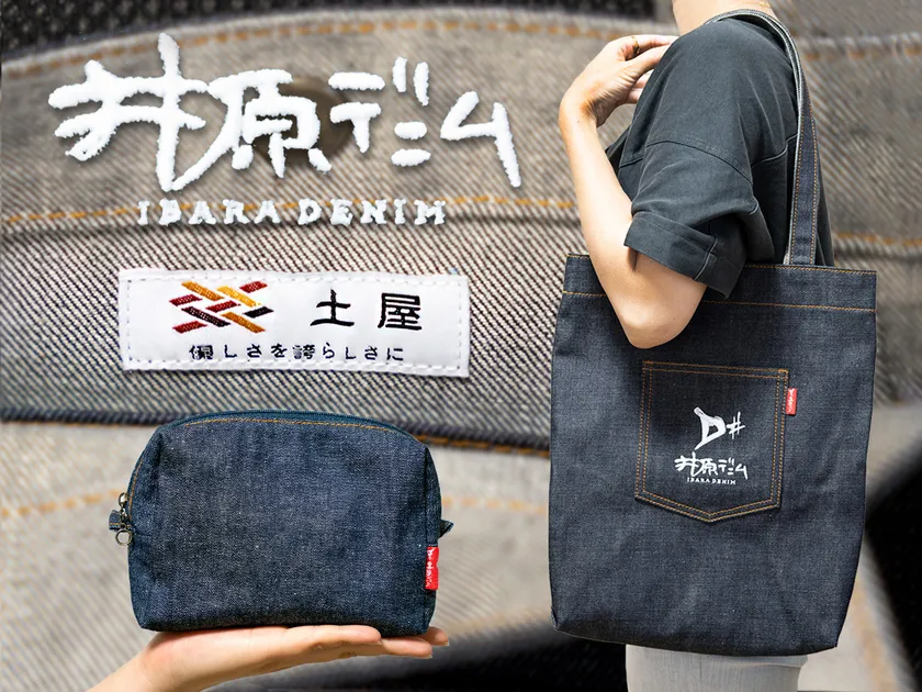 井原デニムのトートバックとマルチケースです。