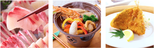 ◆君津の森:お席で銘々に焼き上げる【陶板焼き】はステーキと海鮮の2種をご用意いたしました。他にもはまちのお造りや手作りアジフライなどお酒が進む味、お子様が大好きなメニューでおもてなしいたします。