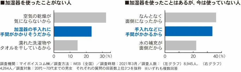 「加湿器を使用したことのない人」「加湿器を使ったことはあるが、今は使っていない人」に「加湿器を使わない理由」を聞いたところ、「お手入れに手間がかかる」ことが上位にあがっています。