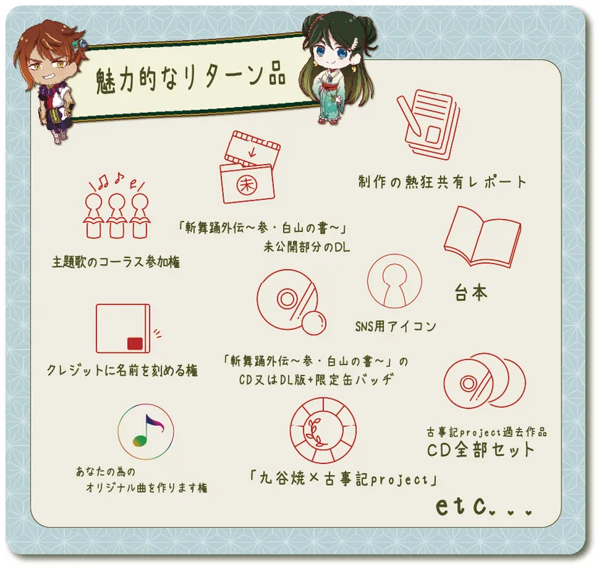 古事記project初のクラウドファンディングということで、参加いただいた皆様には、作品が出来上がっていく貴重なプロセスをメルマガや動画、音声などで逐一共有。イラストがラフから完成していく様、音楽やボイスドラマが徐々にできあがっていく様、はたまた企画会議の様子や制作メンバーの想い等、エンターテイメントが出来上がっていく様子を身近で体感することが出来ます。さらには、「主題歌のコーラスに参加できる権利」といったものまで、クラウドファンディングに参加したことで、【ドラマCDを一緒に作り上げていく体験】ができるようなプランも多数準備しております。