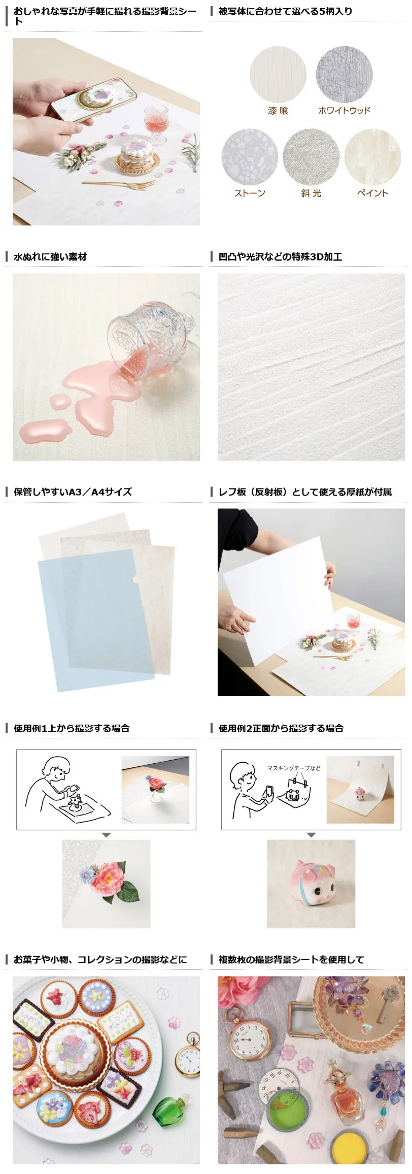 作品の撮影、SNSへの投稿、フリマ出品などの撮影に便利な撮影背景シート5柄入り。