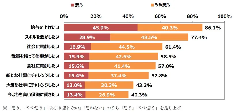 「給与を上げたい」と思う方が最も多く計86.1%、次いで「スキルを活かしたい」計77.4%、「社会に貢献したい」計61.4%と続く結果に。