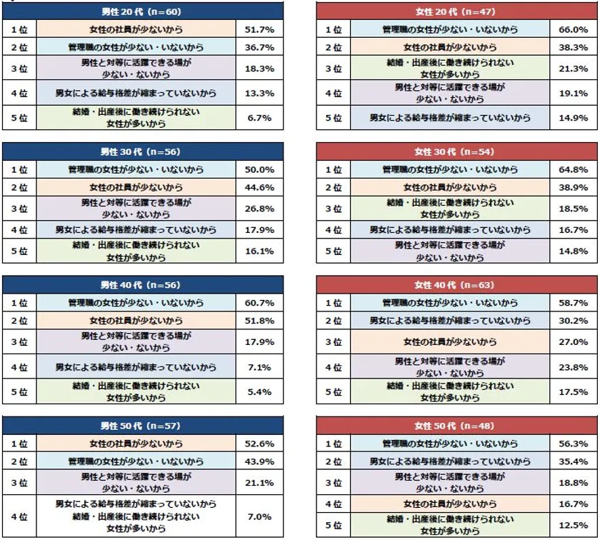 課長クラス以上と回答した方は12.1%。性別で比較をすると、男性は19.8%、女性は4.5%。女性活躍が「進んでいる」と回答したのは全体では計44.9%と半数に満たない結果に。20代の女性は計53.0%が「進んでいる」と回答する一方で、女性40代は37.0%。女性活躍が進んでいるか否かは性別や年代なので感じ方が違うようだ。女性活躍が進んでいないと思うは「管理職の女性が少ないから」が最多。20代30代は女性社員の少なさを感じており、40代50代の男性は活躍の場を、女性は給与格差を感じている傾向に。