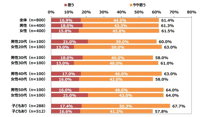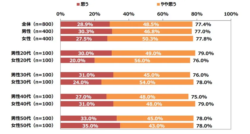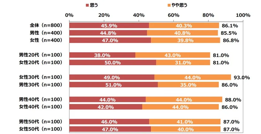 ※「思う」「やや思う」「あまり思わない」「思わない」のうち「思う」「やや思う」を足し上げ